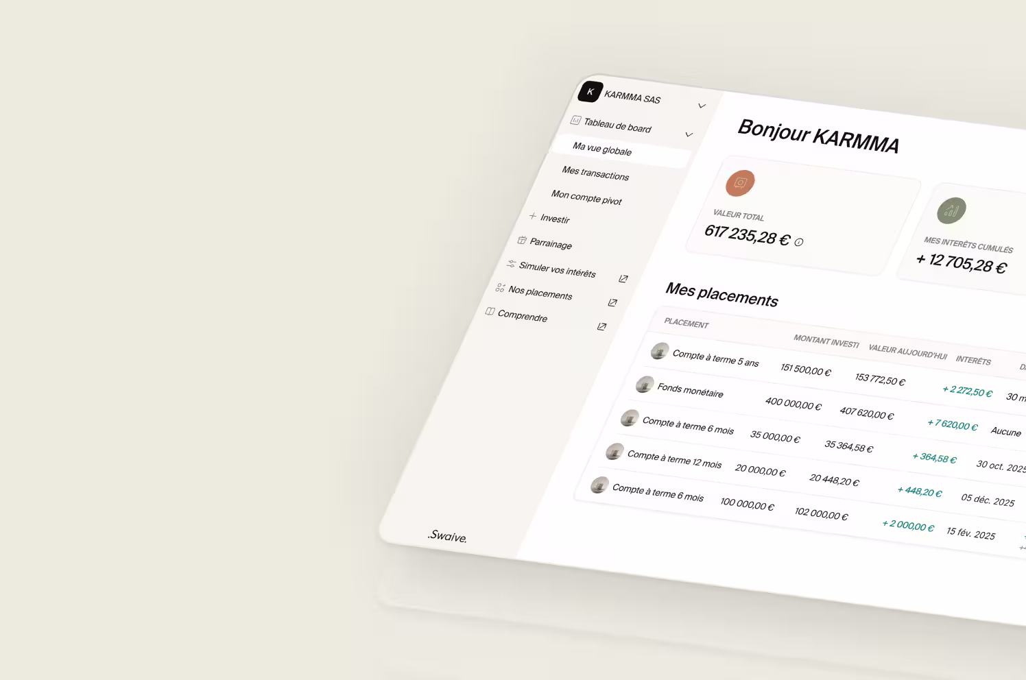 Ouvrez votre compte à terme Swaive en moins de 10 minutes et suivez vos intérêts en temps réel sur la plateforme.