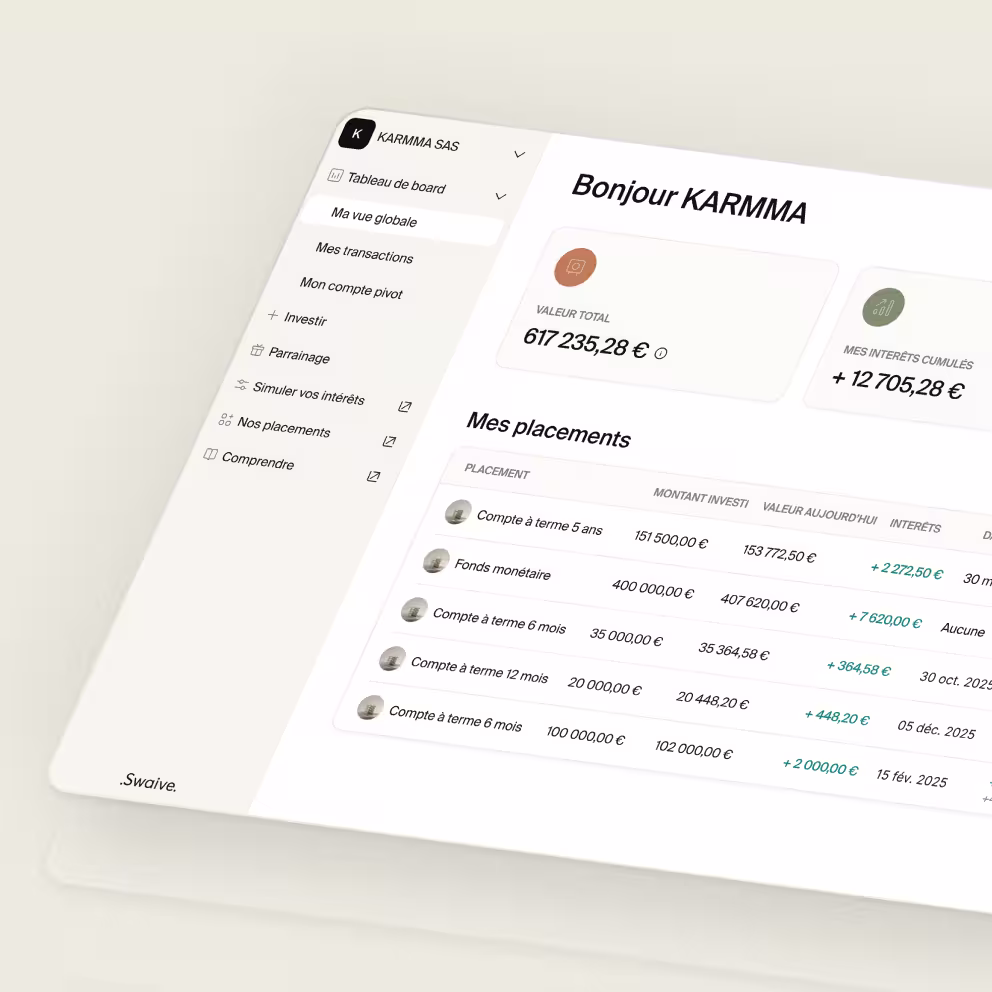 Les fonds monétaires Swaive génèrent des intérêts chaque jour, visibles en temps réel sur la plateforme.